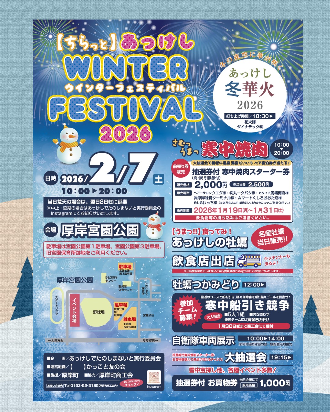 お知らせ 今年で4回目の開催となる、 【ちらっと】あっけしWINTER FESTIVALが今年も開催されます! 雪中宝探しなどなど、子ども向けのイベントも開催します。 2月7日(土)はぜひ厚岸町へお越しください! 【問い合わせ先】 TEL:1053-5-3185(厚岸町商工会内) ※2/4時点、「抽選券付 寒中焼肉スターター券」は販売終了となっております。 ツイート 一覧にもどる
