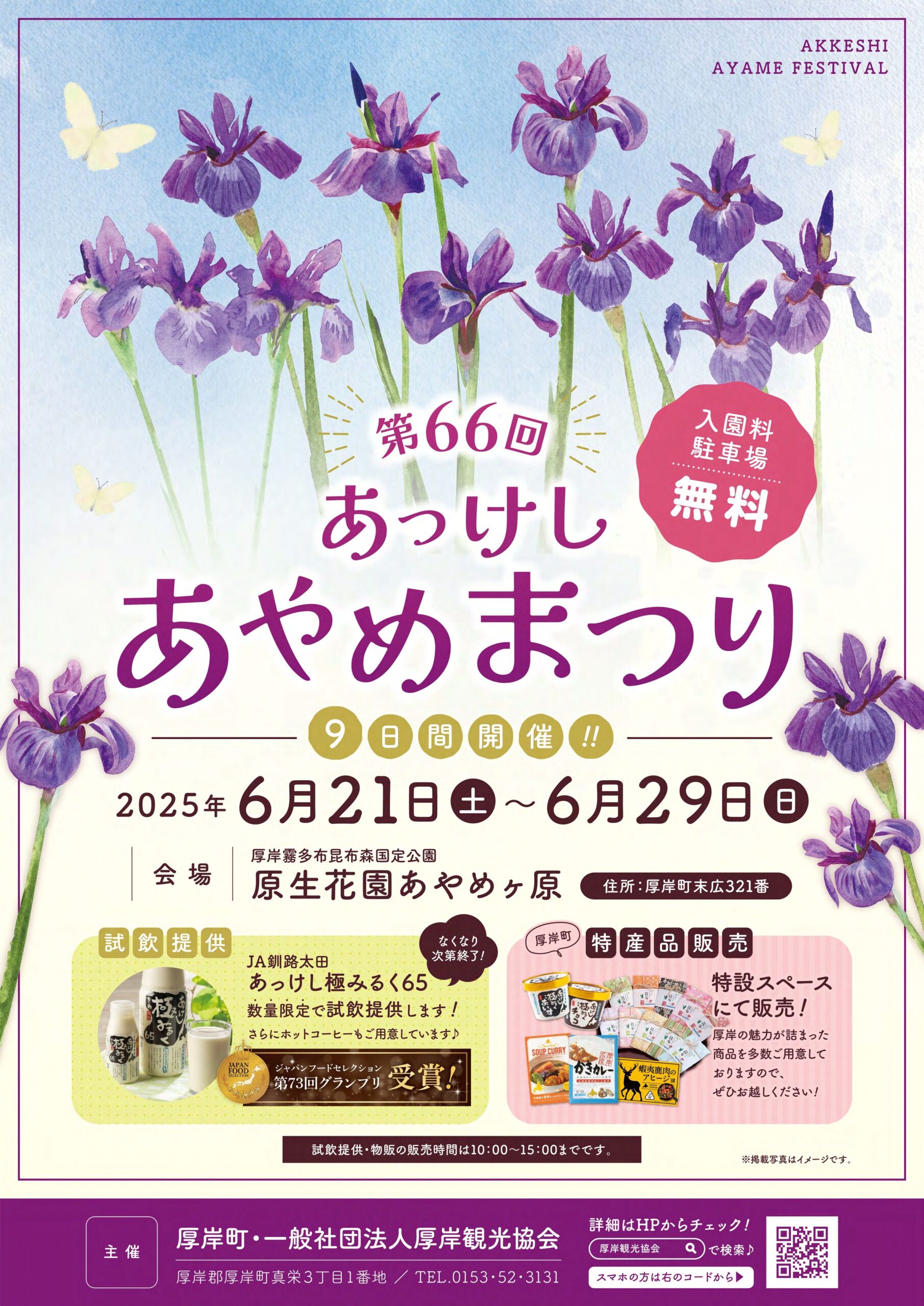 お知らせ \第66回あっけしあやめまつり/を開催します。 期間中は「あっけし極みるく65」の試飲提供、「厚岸町の特産品販売」を行います。 6月13日(金)現在、あやめが何株か咲き始めています! 約30万株のヒオウギアヤメをぜひご覧ください。 たくさんのご来場をお待ちしております。 ツイート 一覧にもどる