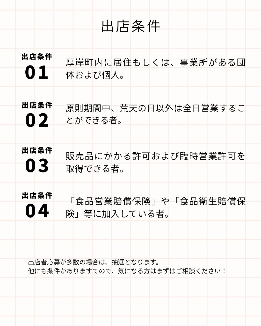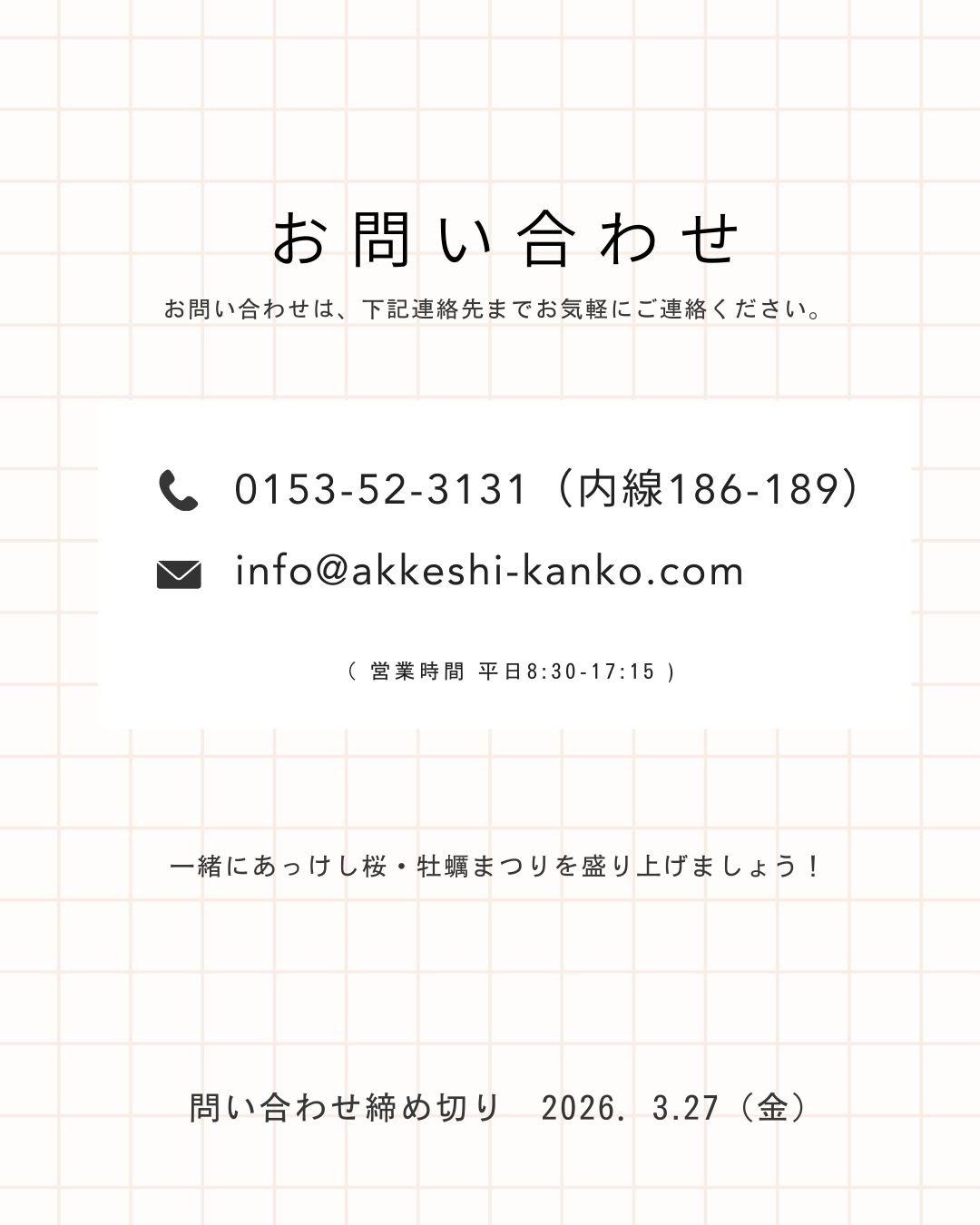 お知らせ 厚岸観光協会では、第77回あっけし桜・牡蠣まつりで 一緒に盛り上げてくれる出店事業者を募集しています! 出店事業者には条件があります。 必ずご確認いただき、気になる方は厚岸観光協会まで お問い合わせください! ※出店内容によっては、お断りする可能性もあります。 ご了承ください。 ---問い合わせ先--- 厚岸観光協会事務局 電話 0153-52-3131 メールでのお問い合わせはこちらから ツイート 一覧にもどる